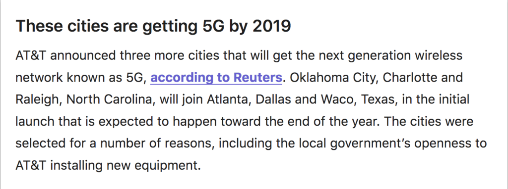 Source Article: AT&T reveals three more cities for 5G launch by end of year https://www.reuters.com/article/us-at-t-5g/att-reveals-three-more-cities-for-5g-launch-by-end-of-year-idUSKBN1KA1RH
