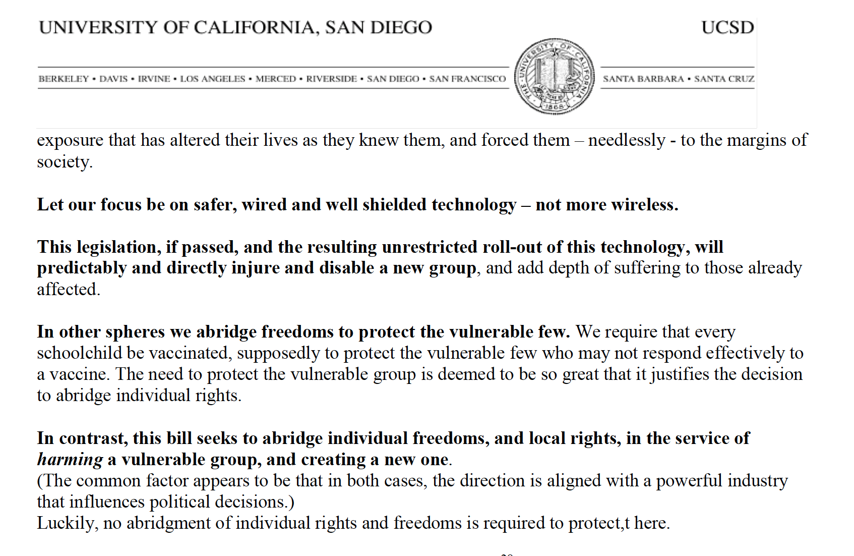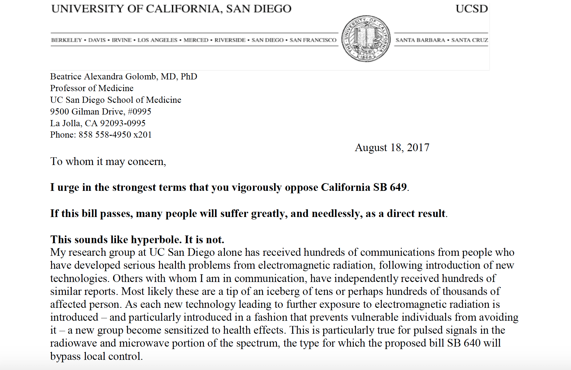(3) Letter from Dr. Beatrice Golomb opposing California SB 649.