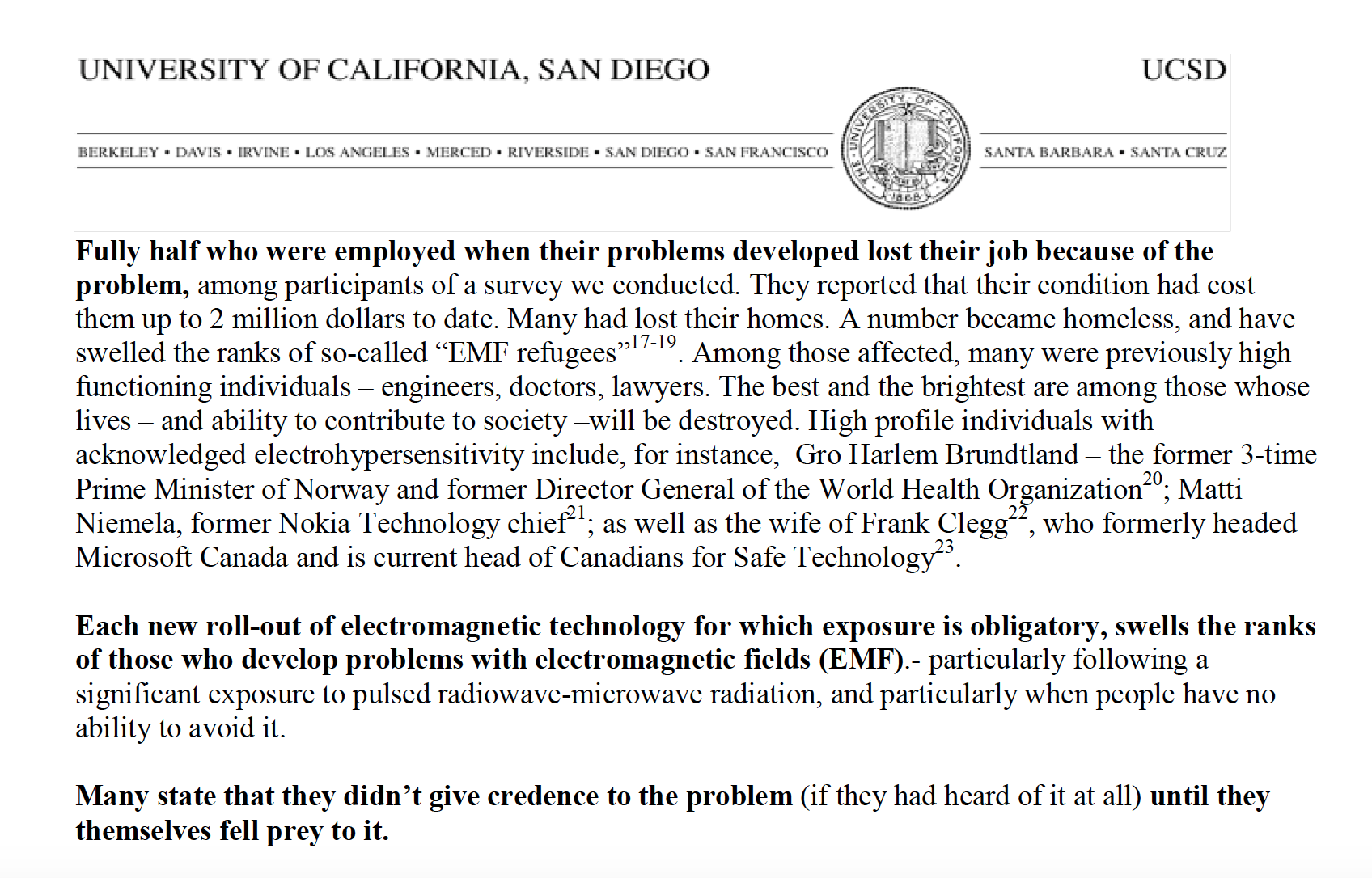 WHEREAS, both the U. S. and Canadian governments established regulatory limits for RF radiation based on thermal (heat) measurements with no regard for the adverse health effects from non-thermal radiation which is proven to harm the human brain and immune system;…