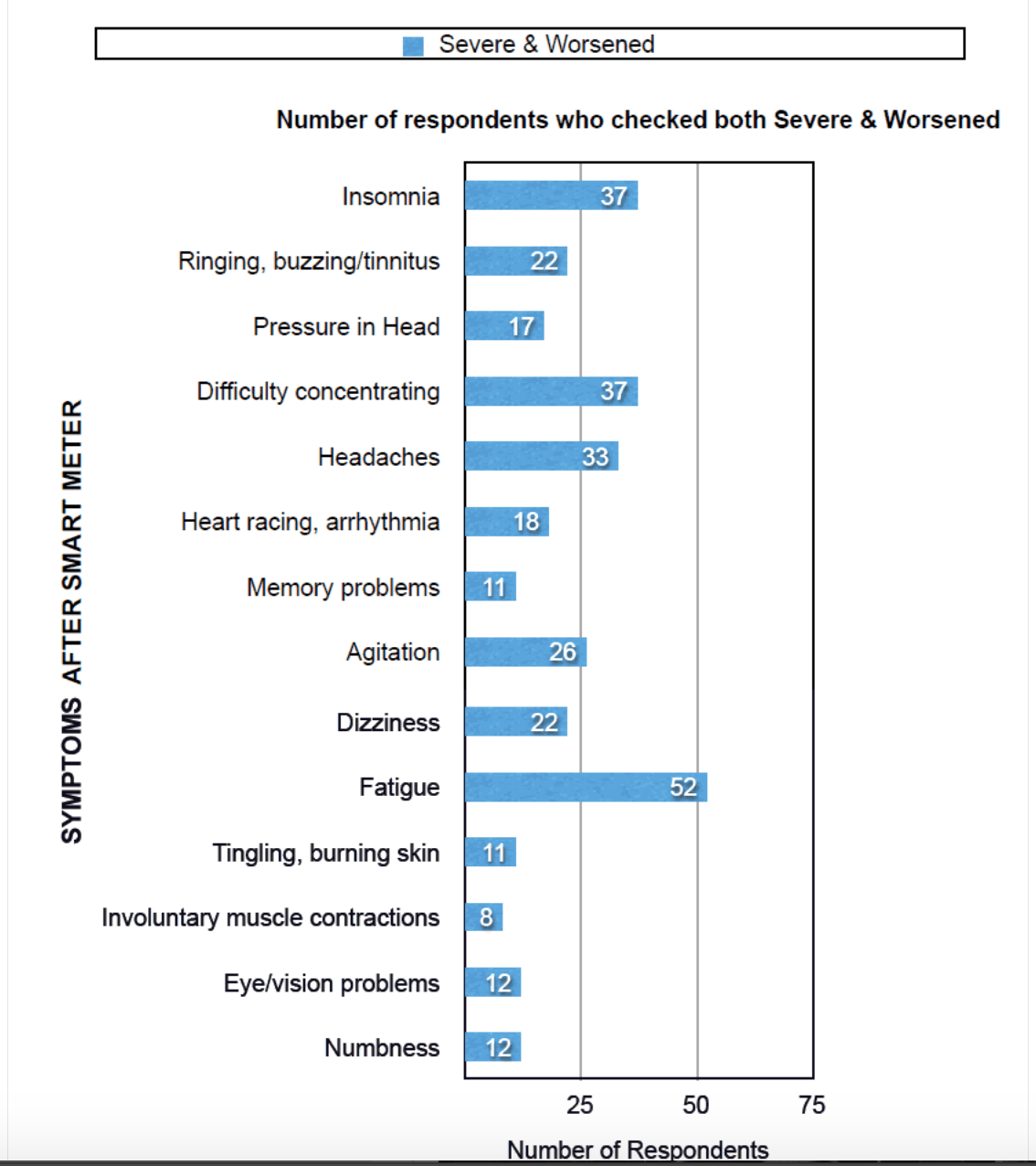 The survey does not address the frequency of occurrence of symptoms in the general population when exposed to Smart Meters. So the survey does not tell us how likely it is that a person in the general population will experience symptoms after exposure to Smart Meters. But the survey does tell us what types of symptoms are being experienced by those who do become symptomatic after exposure to Smart Meters.